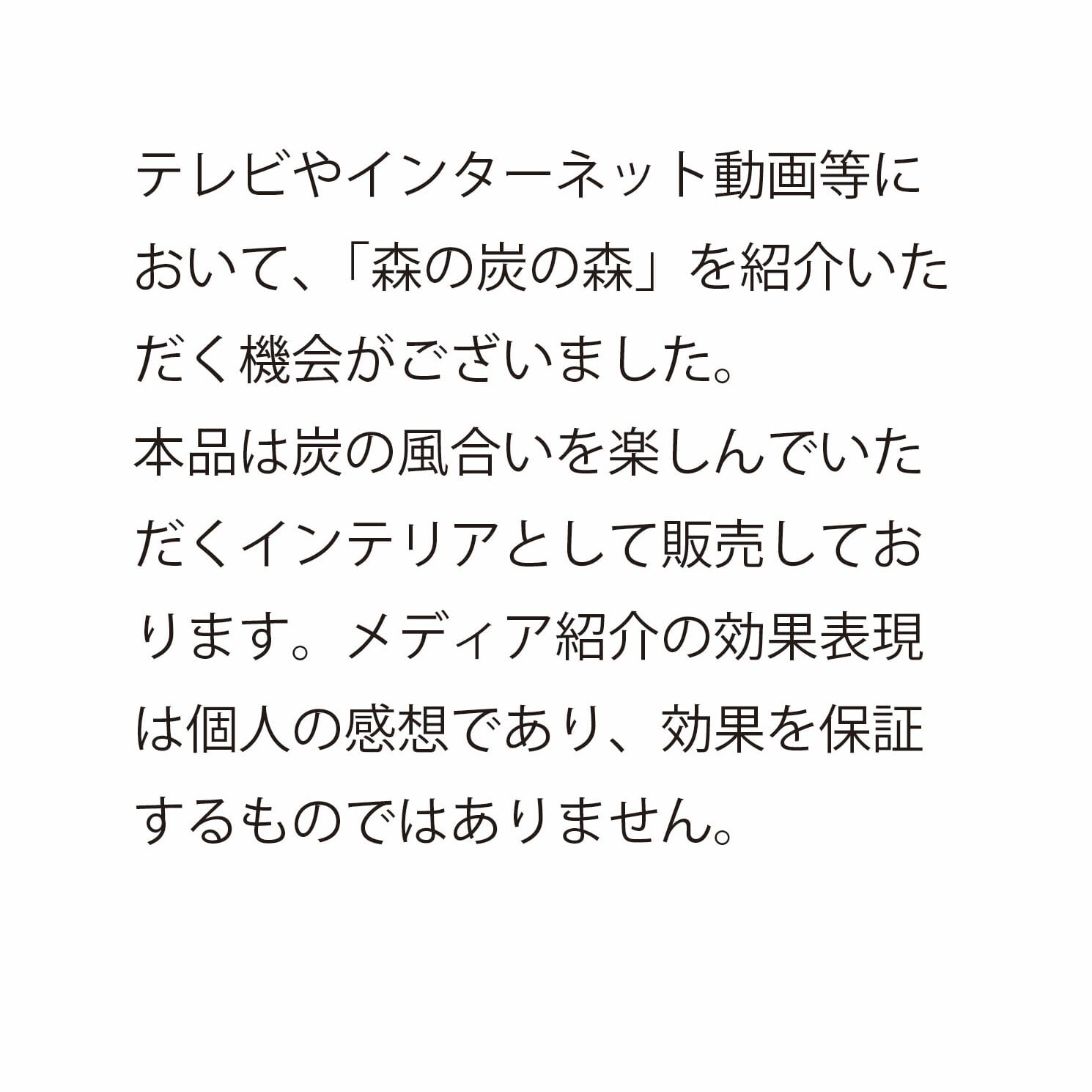 弊社が依頼した広告ではなく、内容についても事前に確認・承認したものではありません。本商品は炭の風合いを楽しむインテリアとして販売しております。炭の特性として一般的に調湿やにおい吸着が知られておりますが、特定の効果効能を保証する商品ではございません。TV・SNSメディア等で紹介された内容は出演者個人の感想によるものです。